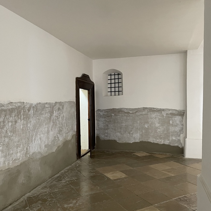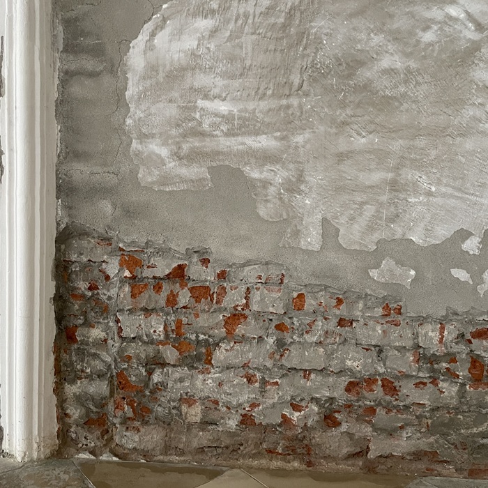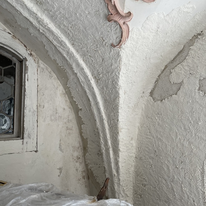 | Stand 22. Oktober 2025_verputzen der freigelegten Bereiche im Sockelbereich mit Kalkputz. |