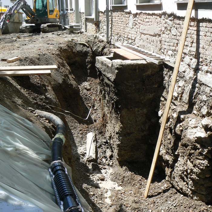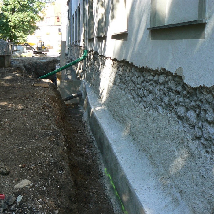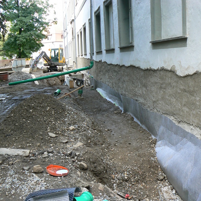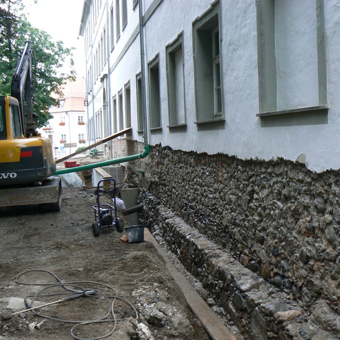| Stand Mai 2008_Abschlagen des geschädigten Sockelputzes, Aushub bis Fundamentsohle. |